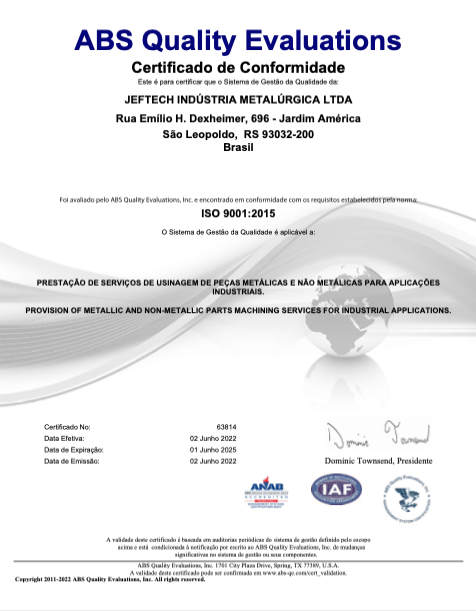 A JEFTECH é certificada pelo ABS Quality Evaluations, na norma NBR ISO 9001:2015 e mantém seus processos em melhoria contínua.